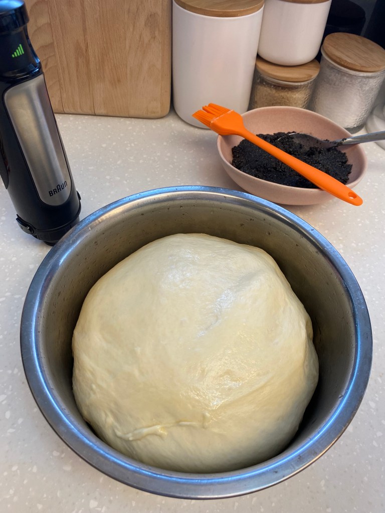 把麵團用中速打10分鐘左右後取出 (不要連續超過一分鐘哦,打一打就要休息一下~) ,用手揉成一個光滑的麵糰,收口朝下,用保鮮膜封住,室溫發酵至2倍大。