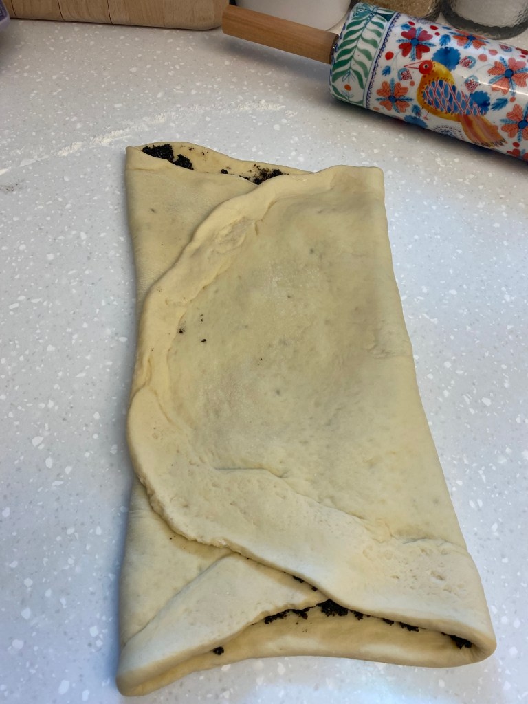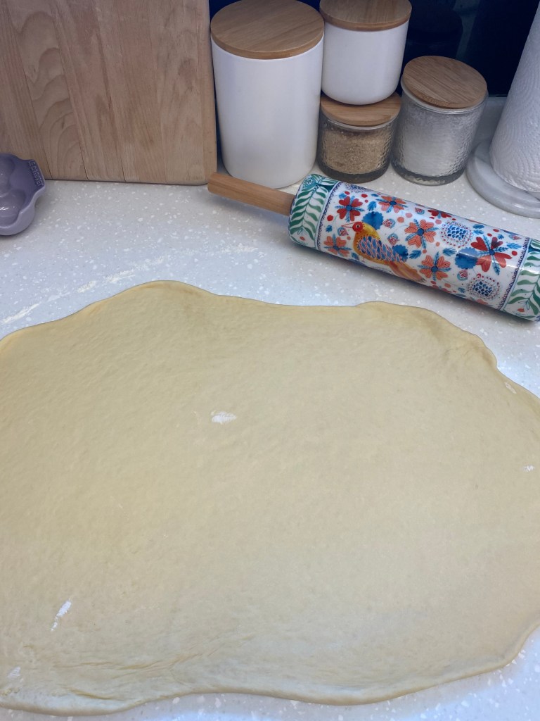 桌上和麵團上都撒上少許麵粉,把麵團桿成一個大的長方形。