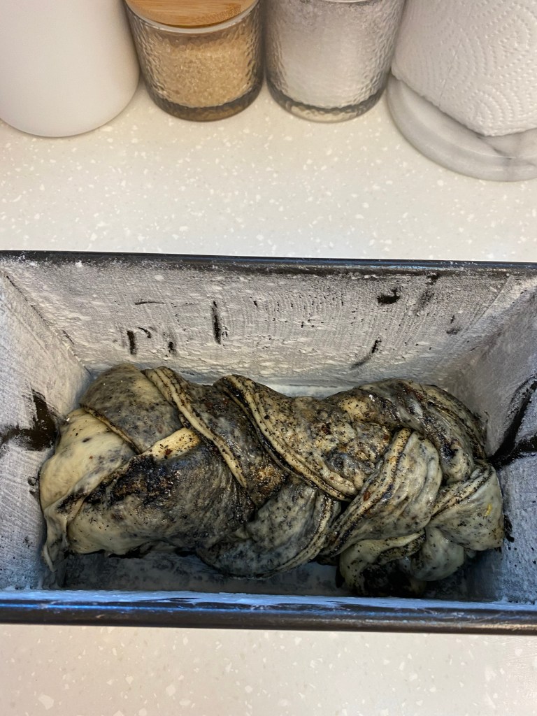 ➔ 時間到取出,趁還熱的時候把吐司在桌上敲一敲,慢慢輕輕的從模型中倒出來放涼~黑芝麻大理石吐司完成!(廚房都是烤黑芝麻的香氣,舒適~)