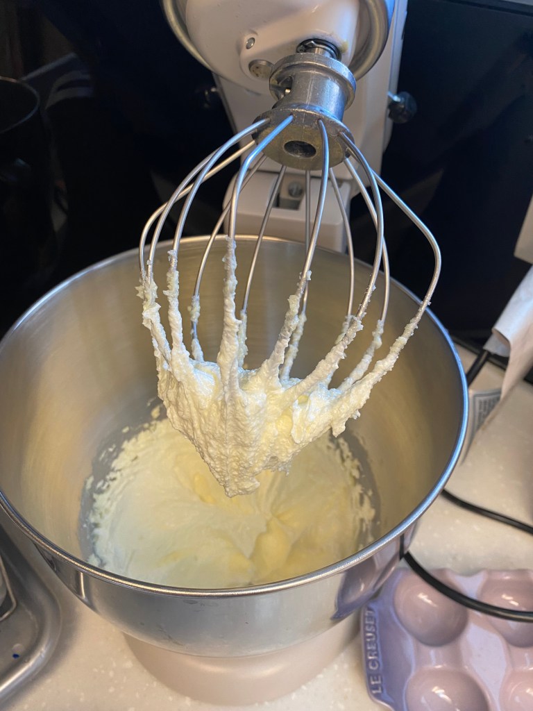 把雞蛋加入、少量多次的加,每次都吸收混合均勻後再加下一次,再加入低筋麵粉、泡打粉一起攪拌均勻。