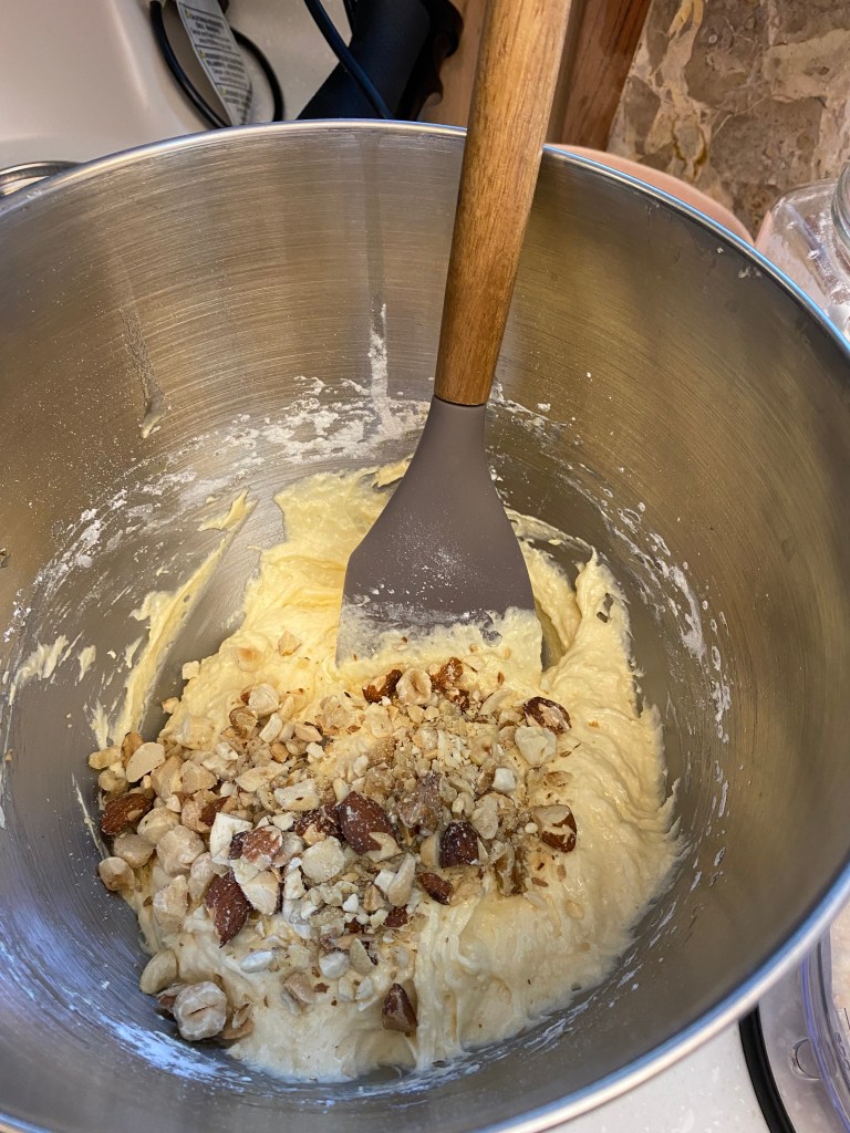 將打碎的核桃拌入麵糊中,並取其中1/3的麵糊出來,混入濃縮咖啡液,再把混有咖啡液的麵糊倒回原麵糊中,不用過度攪拌,這樣烤出來的蛋糕會有大理石紋。