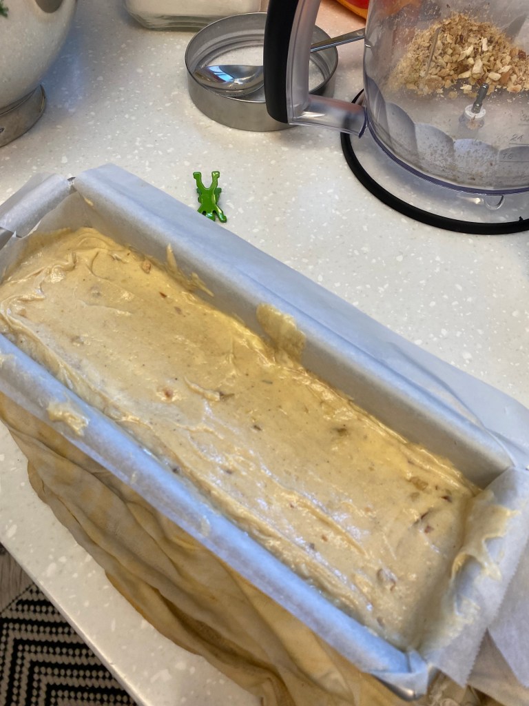 將磅蛋糕模型放入烤模紙,將麵糊倒入,並將表面抹平,在桌上敲幾下,讓空氣排出(頂端也可以再撒上一些核桃~)。