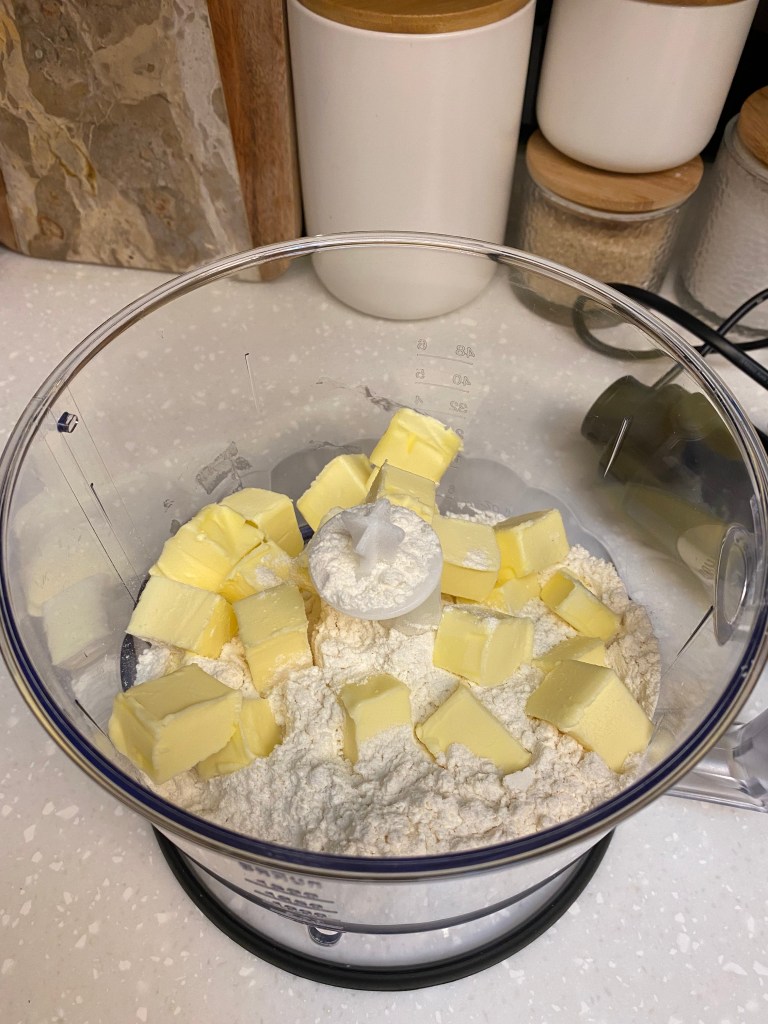 前一晚先將派皮做好,將低筋麵粉、中筋麵粉、奶油、鹽放入食物調理機中攪拌均勻,再慢慢倒入適量冰水。