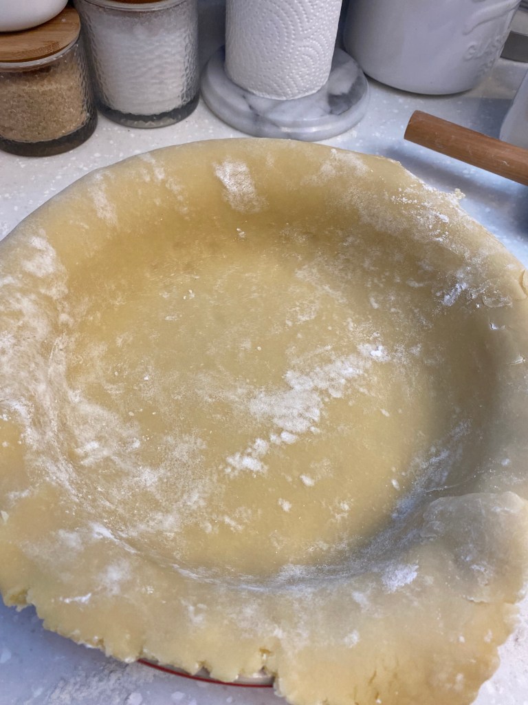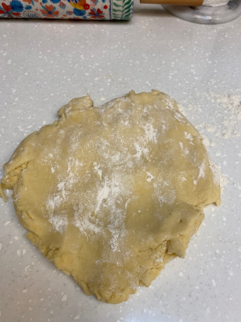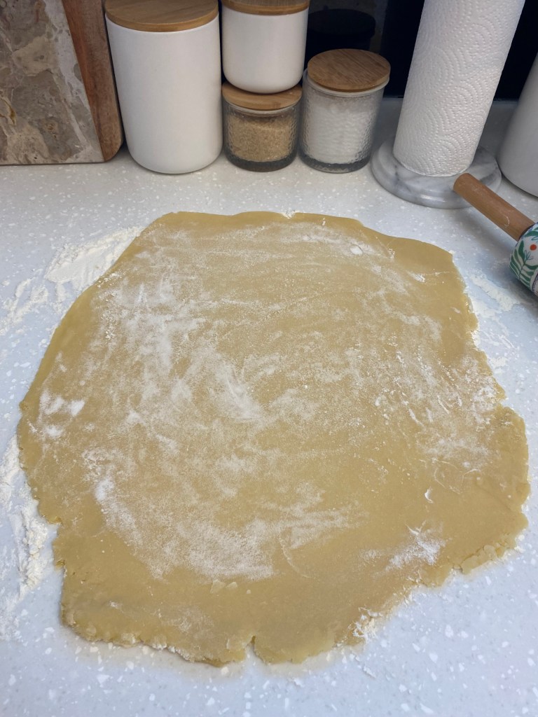 再回來處理派皮,將冰過的派皮提前拿出來稍微回溫,在桌面灑上麵粉,將派皮麵團桿開,在麵團上也灑上麵粉,桿開成一大張。
