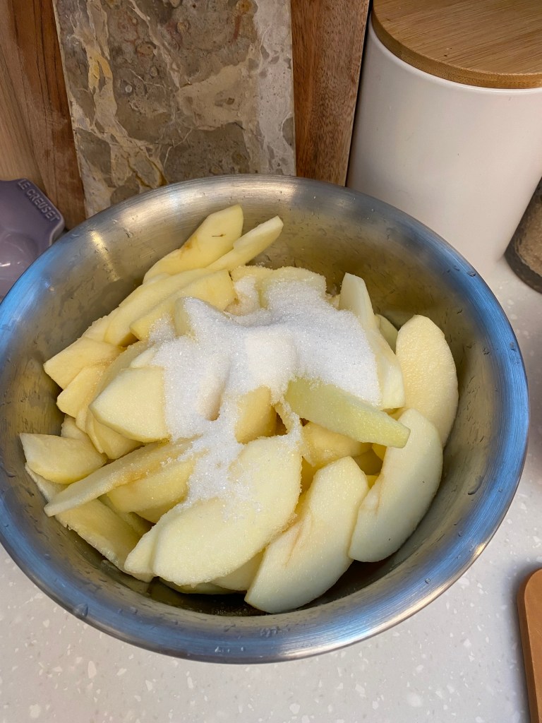 將蘋果削皮切片,放入一個大盆中、並灑入砂糖、檸檬汁抓均勻。