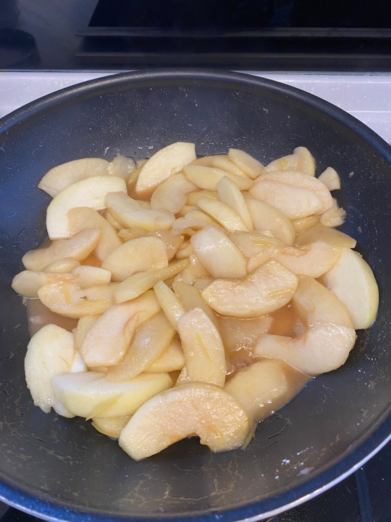 煮至蘋果變軟時轉小火,加入肉桂粉、並灑入適量檸檬皮屑、太白粉,蓋上鍋蓋煮8分鐘(這時間差不多,再多蘋果就會過軟了哦~)
