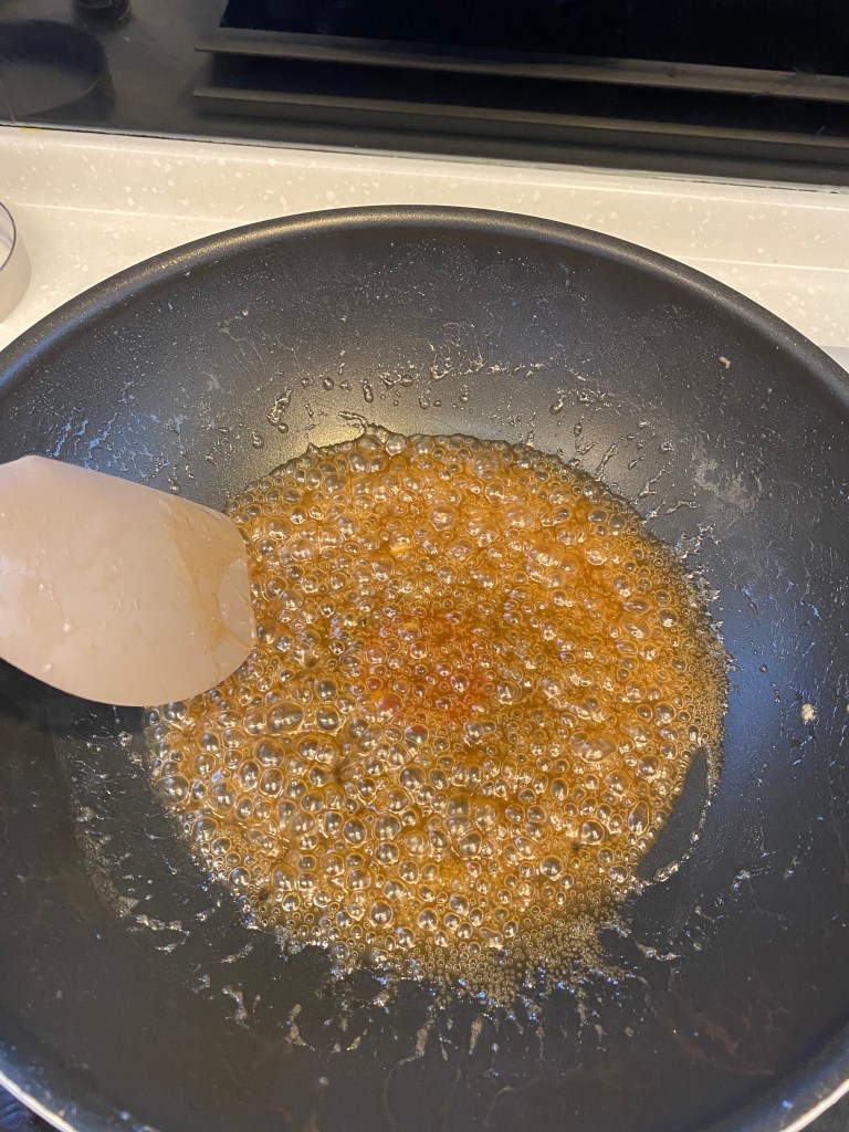 時間到將煮好的蘋果放在篩網上瀝乾放涼,多出來的湯汁倒回鍋中小火繼續加熱,讓它成為濃縮醬汁,等等備用。