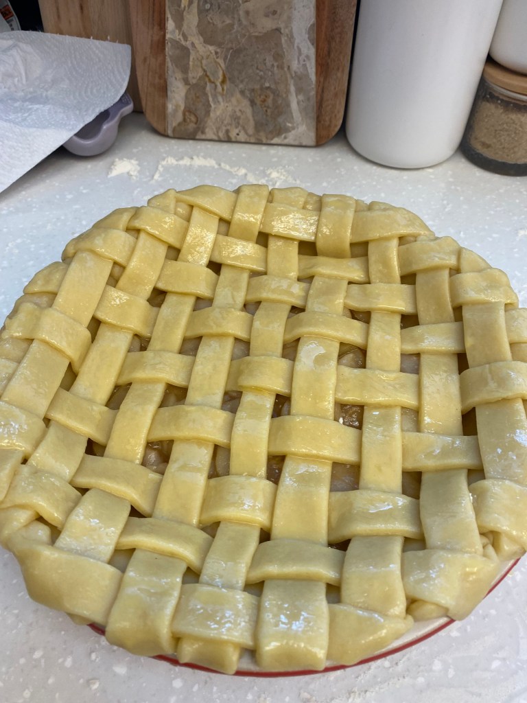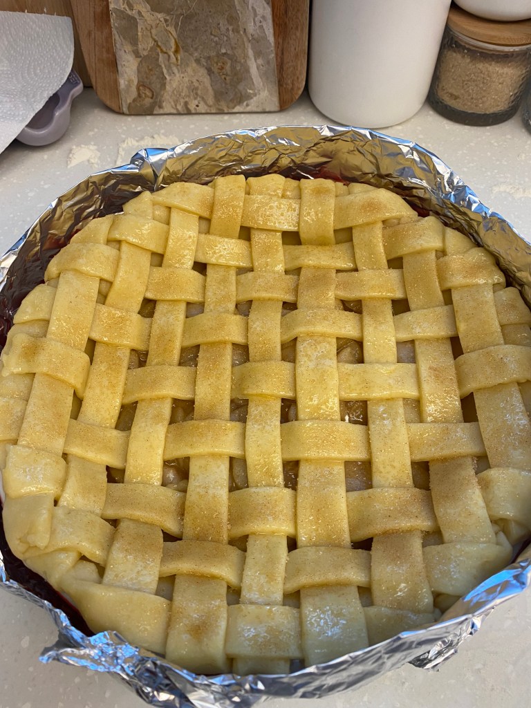 將剩下一半的派皮桿成一大張,用滾刀將派皮切成每條2cm的寬度(可以用長型烤盤輔助切割線~),做成編織狀,多於的派皮一樣用刀切並收進邊邊裡,讓邊緣看起來更整齊,然後刷上蛋液。