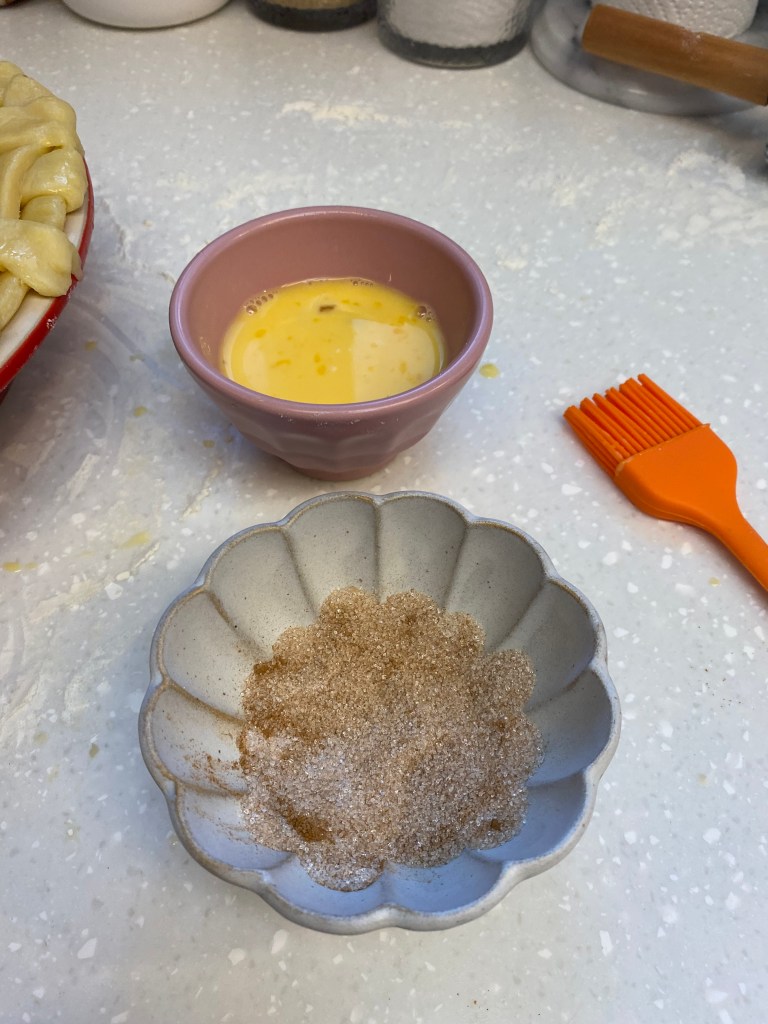 在派皮上灑上砂糖肉桂粉(放進烤箱前如果怕蘋果內餡流出,可以在周圍圍一圈錫箔紙~)