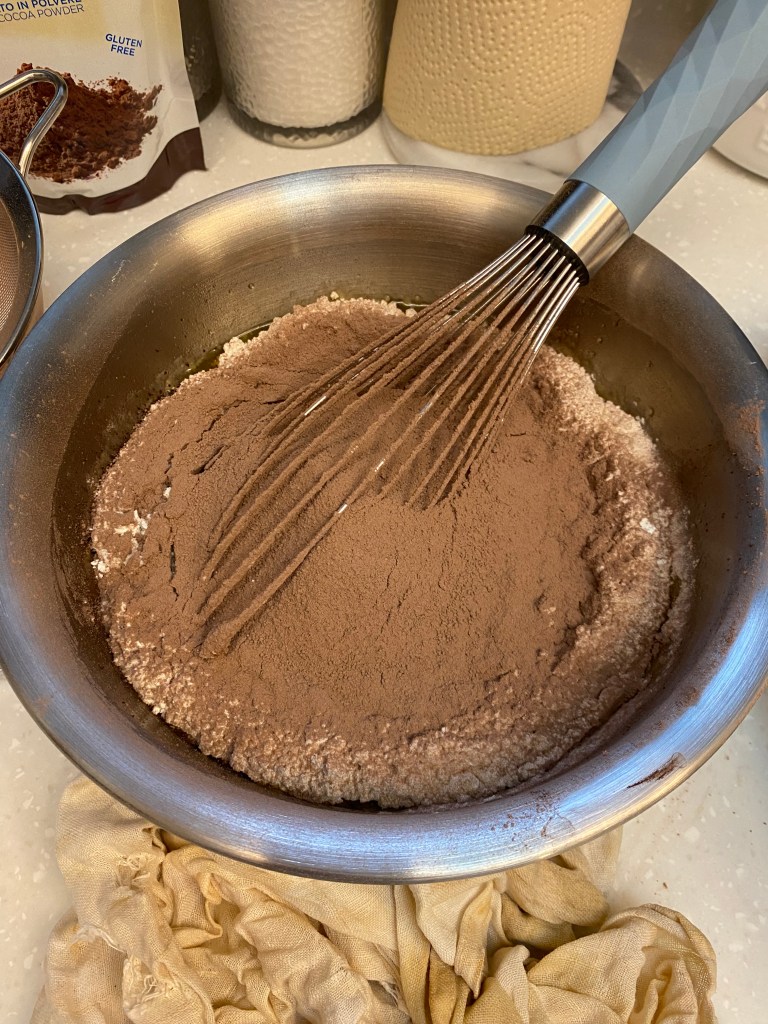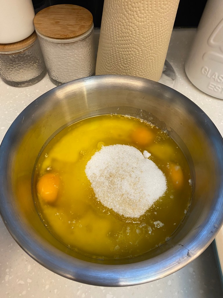 在大盆中倒入雞蛋、融化奶油、二砂糖、白砂糖、香草精、濃縮咖啡、鹽,攪拌均勻。