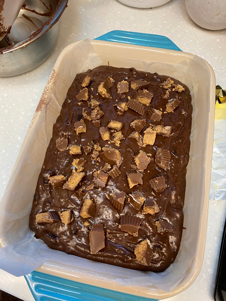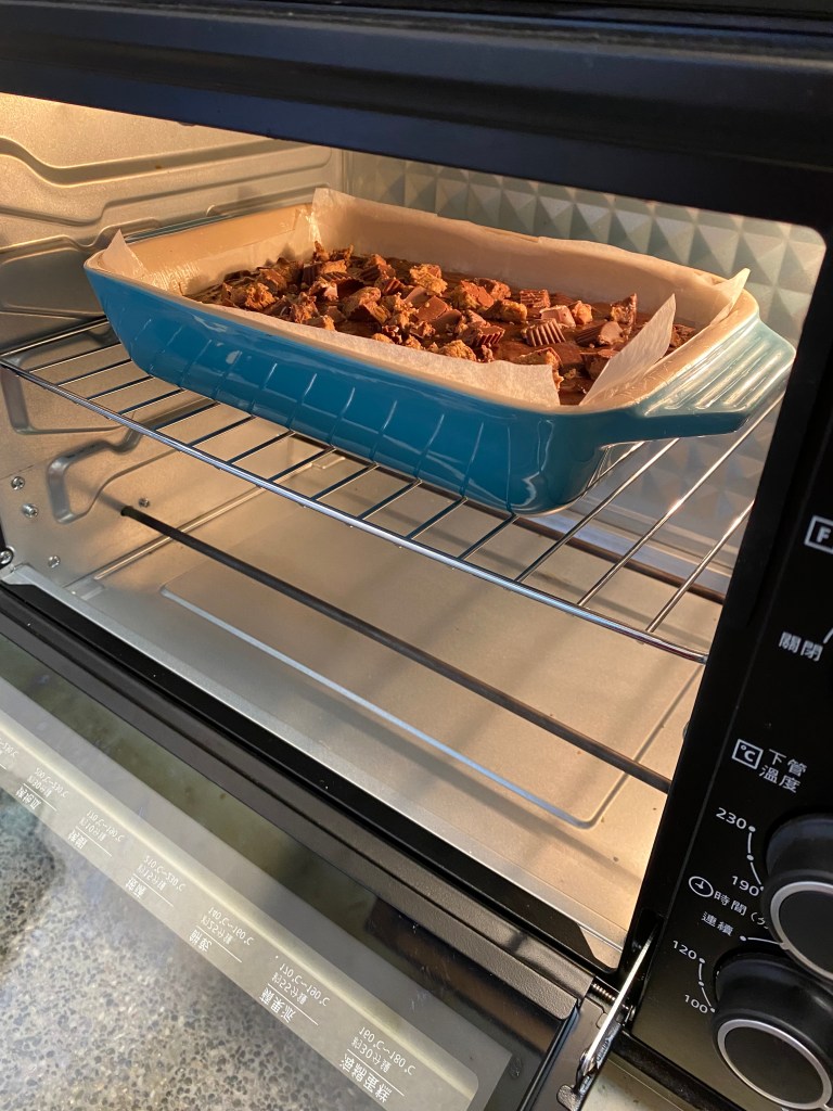 在方形烤盤中墊入烤盤紙(放入烤盤紙之前先用奶油刷過烤盤,這樣烤盤紙比較貼合哦~),將巧克力麵糊倒入,再上放撒上切碎的reese’s花生醬巧克力。