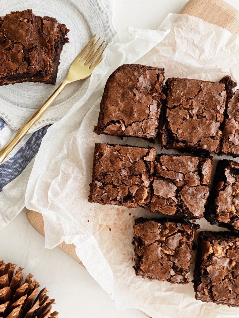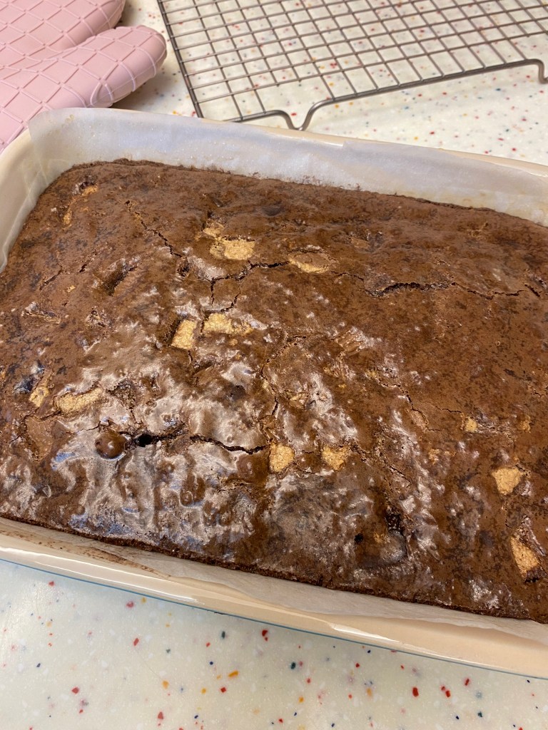 這是我第一次做布朗尼,成品非常成功呀😌👏🏻,最上方我還鋪了reese’s花生醬巧克力(全聯竟然有賣了!),所以我的布朗尼吃起來還有股花生醬香氣🥜~