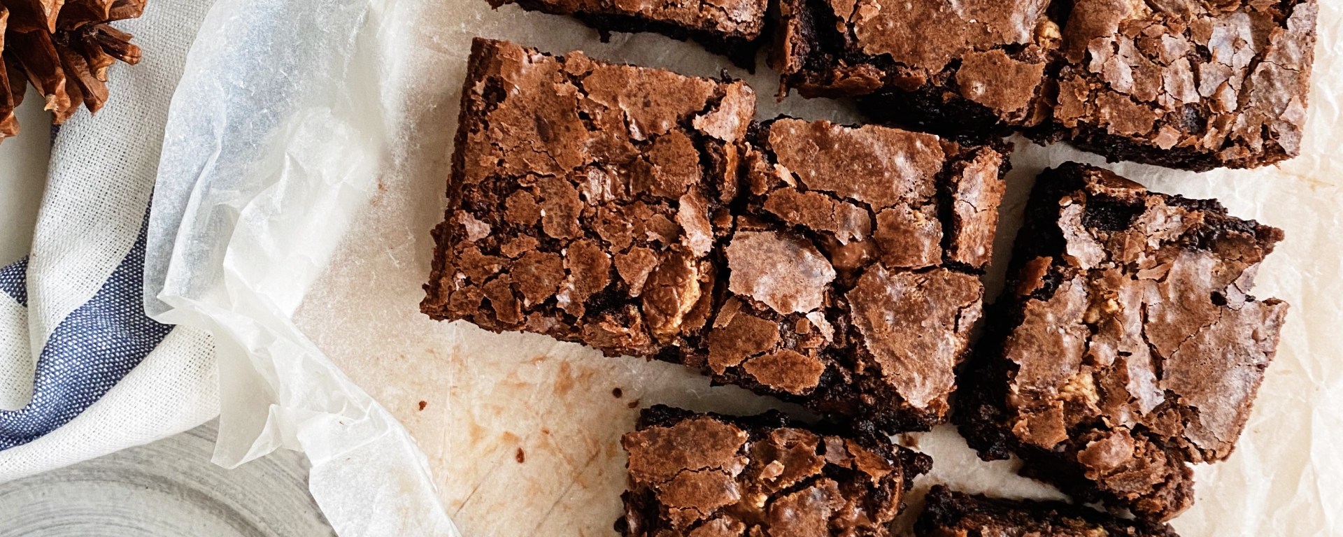 時間到取出烤盤,放涼後再將布朗尼連同烤盤紙取出(表面會有些許自然的漂亮龜裂哦~)。