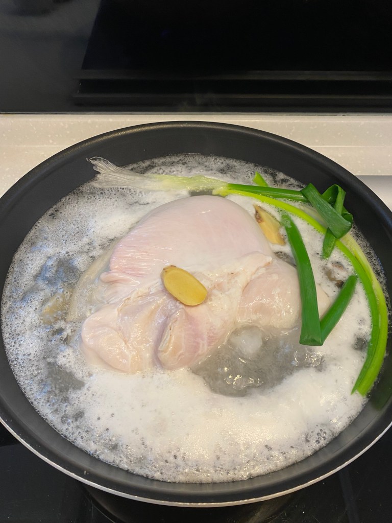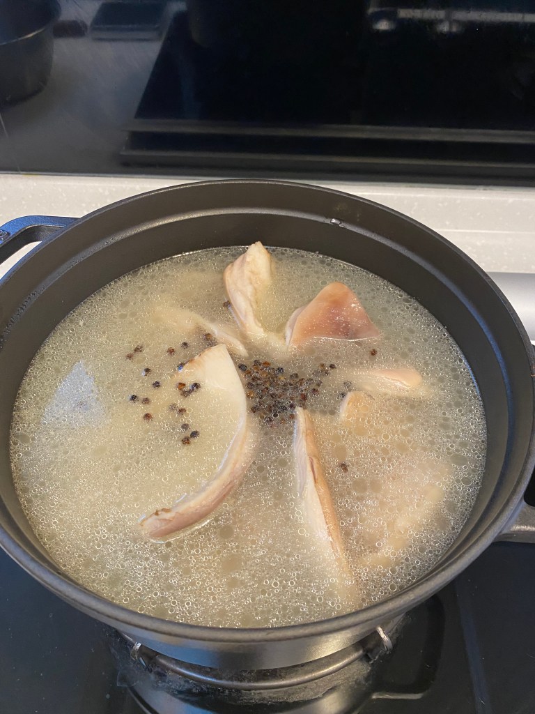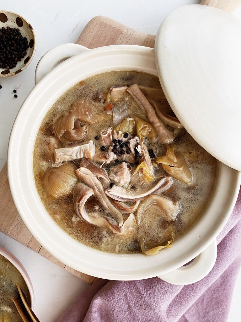 在旁邊的爐火燒一鍋滾水,倒進豬肚鍋中,並加入雞腿塊,大火煮20分鐘,這時的湯就慢慢會呈現白色了。