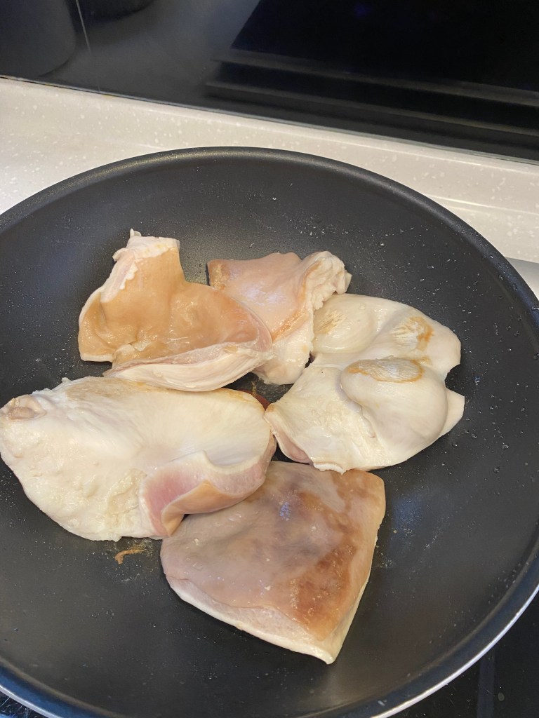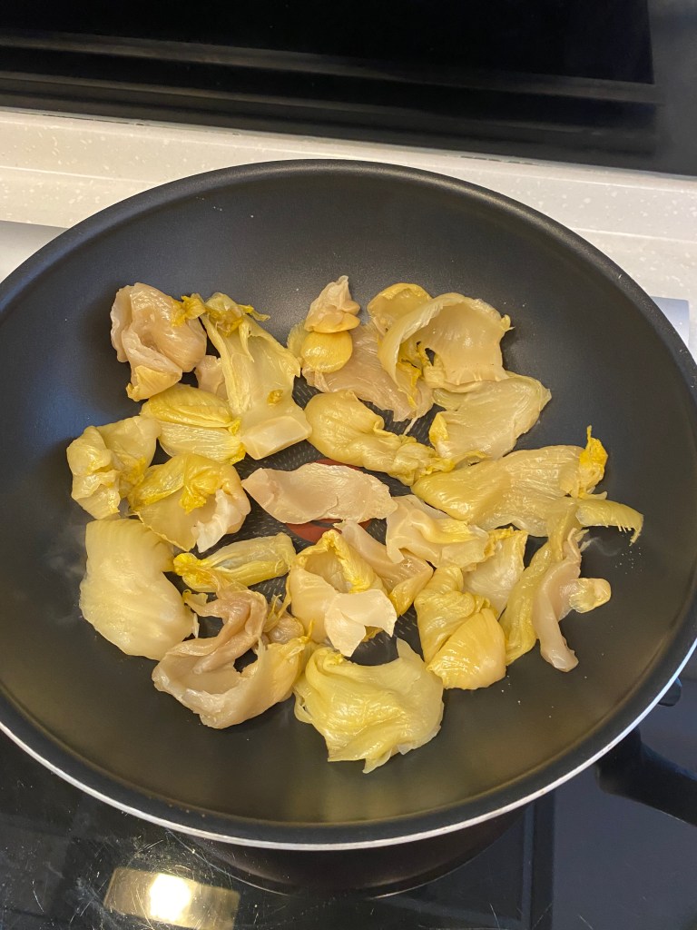 另一邊將酸菜撕成好入口的大小,放入平底鍋中稍微乾煎取出。