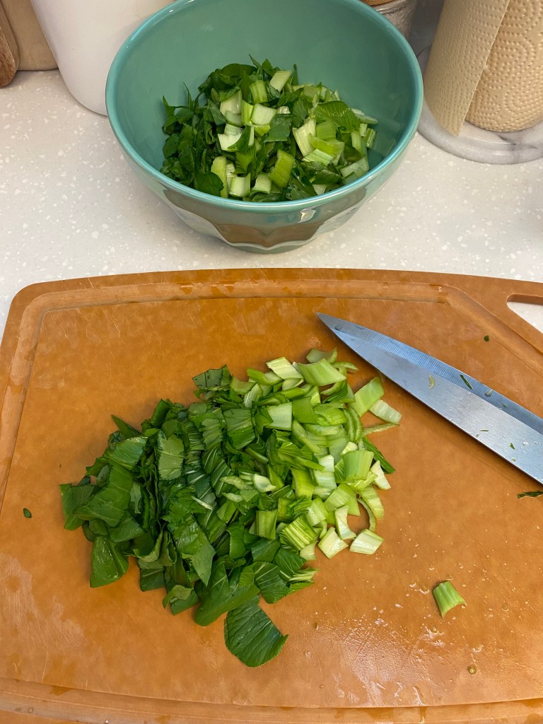 青江菜洗乾淨,切成小塊,用鹽抓過放置一旁備用。