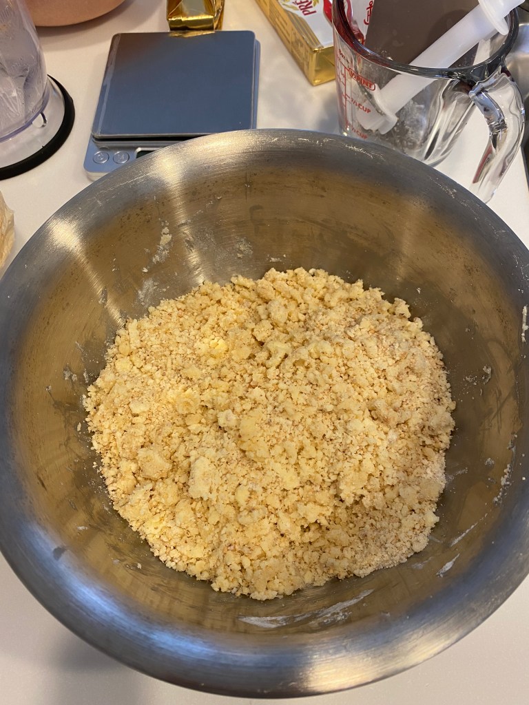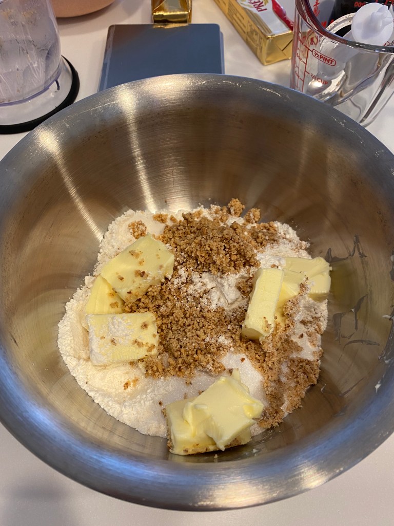 在盆中倒入低筋麵粉、融化奶油、剛剛打碎的核桃粉、砂糖,攪拌均勻。