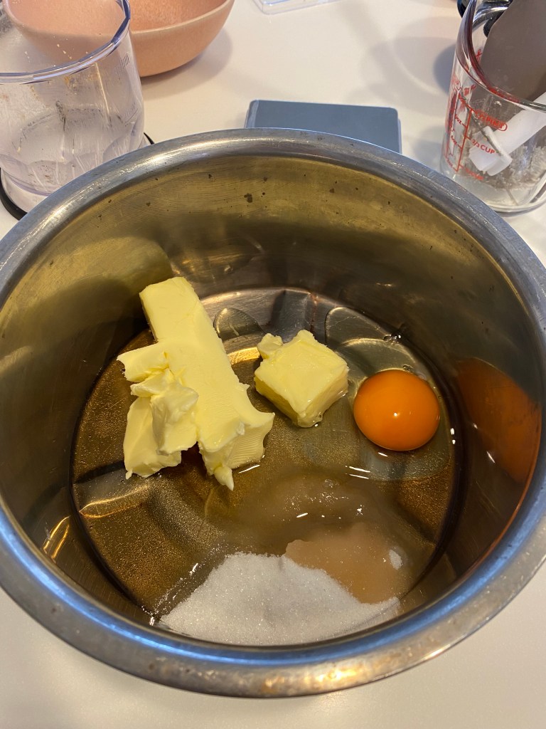 在另一個盆開始製作蘋果蛋糕,盆中倒入軟化奶油、楓糖漿、砂糖、雞蛋。