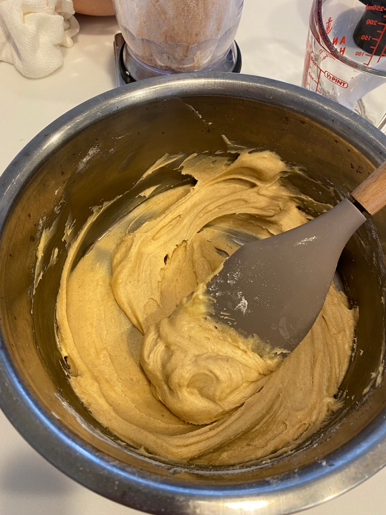 再倒入過篩的低筋麵粉、肉桂粉、混合均勻。