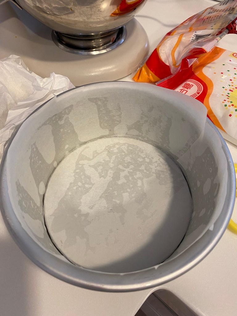 在蛋糕模中放入烘焙紙(可以在周圍刷上一層油讓烘焙紙更服貼~)