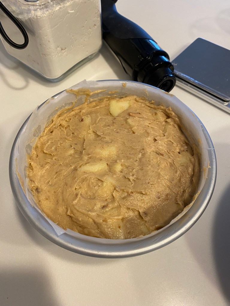 在蛋糕模中倒入蘋果麵糊,並抹均勻平整在蛋糕模中放入烘焙紙(可以放在桌上輕敲幾下)