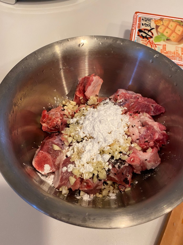 在盆中放入排骨、豆豉末、蒜末、醬油、雞粉、太白粉,抓醃15分鐘。