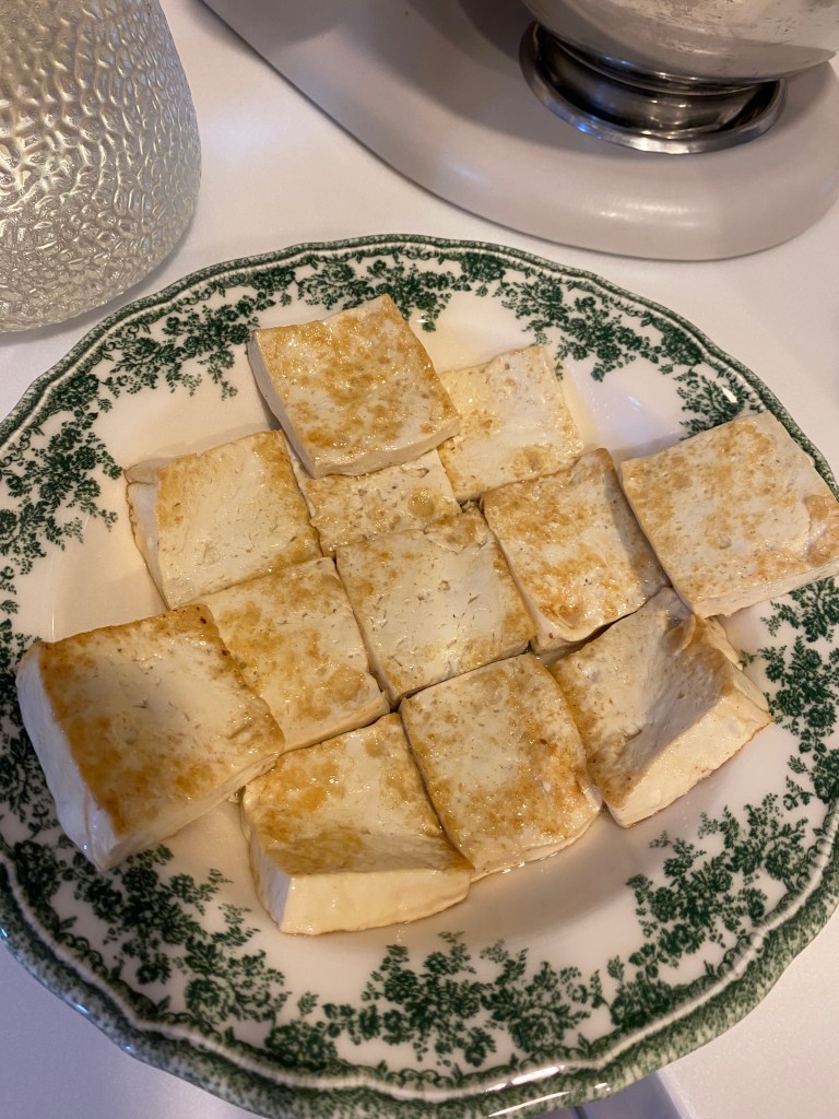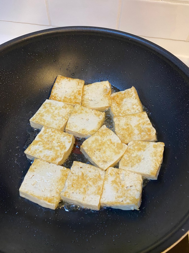 另一邊,在鍋中倒入少許油,放入切片的板豆腐,雙面煎至金黃(每次煎豆腐都好會噴油,建議可以蓋上鍋蓋哦~)