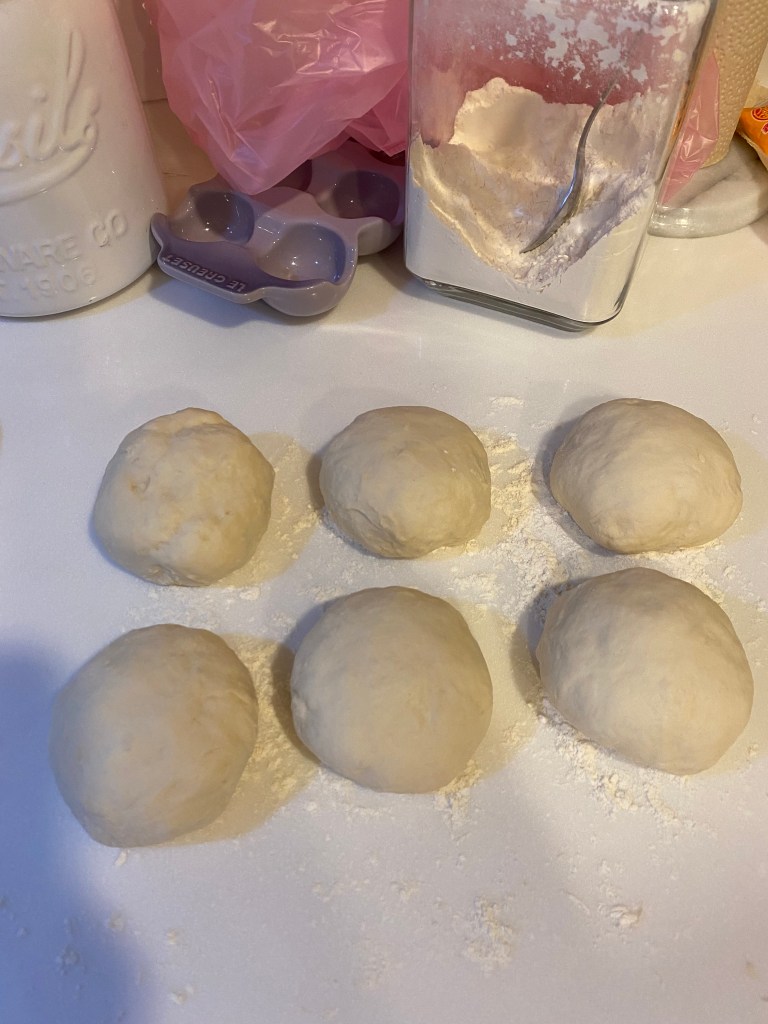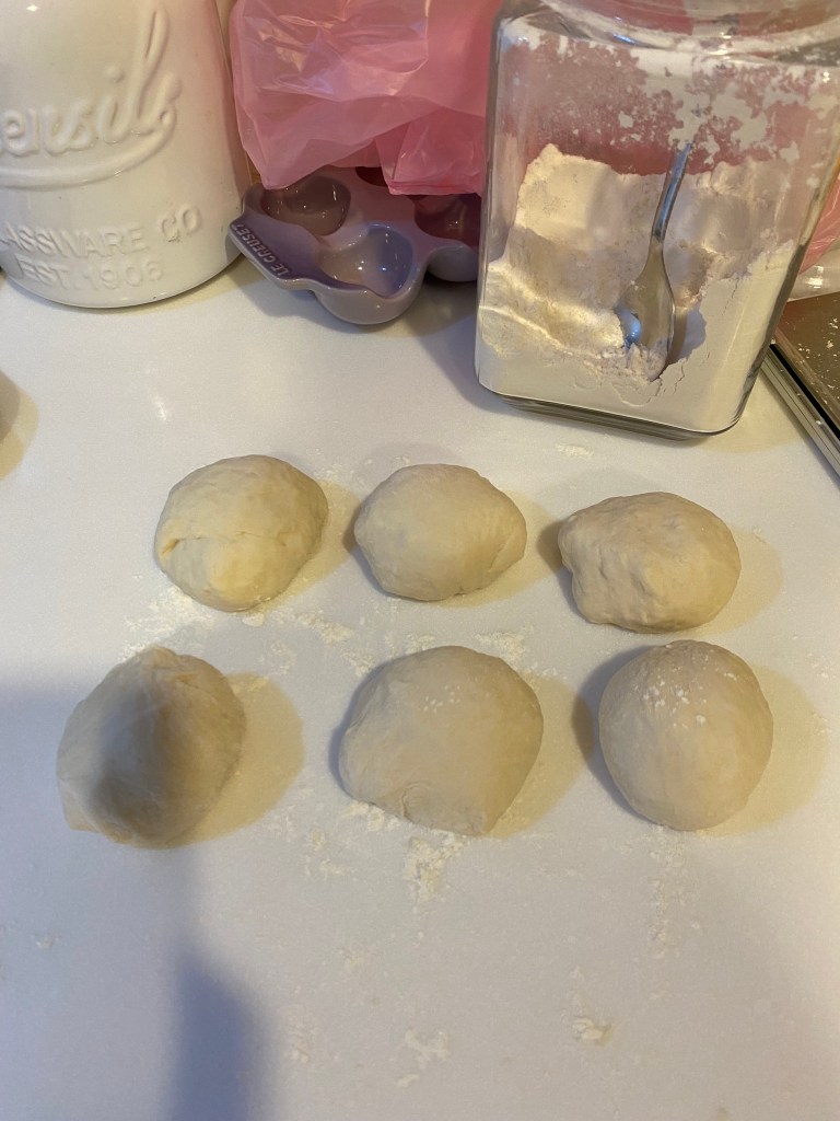 將每個對切的麵團壓扁,再用桿麵棍桿開,等等就可以直接下鍋煎了!