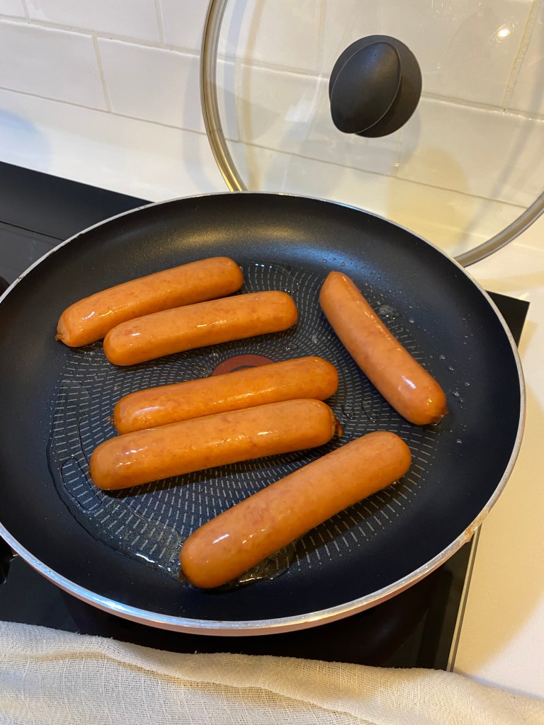 用平底鍋將香腸用橄欖油稍微煎至表面金黃(我只有買到這種德式香腸,如果有肉腸會更好)