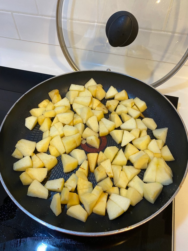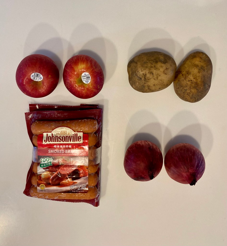 將蘋果去皮切成丁,將香腸取出,用原鍋裡的油繼續煎蘋果。