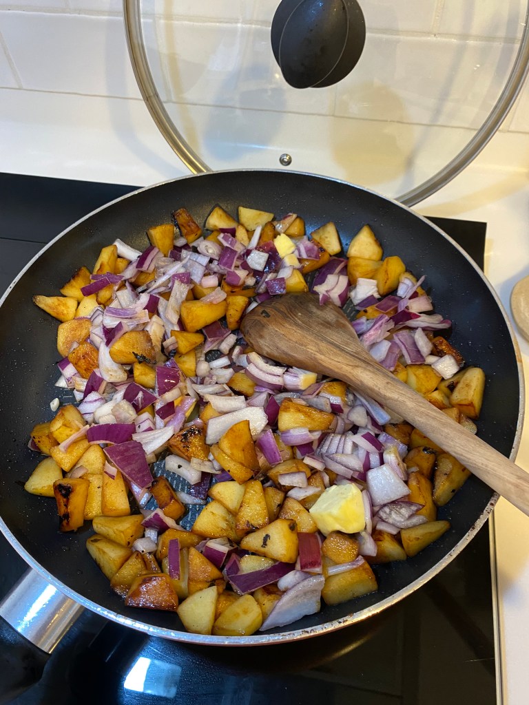 蘋果煎至變色後繼續放入洋蔥丁拌炒(如果這時覺得鍋子有點乾可以再放入一點奶油~)