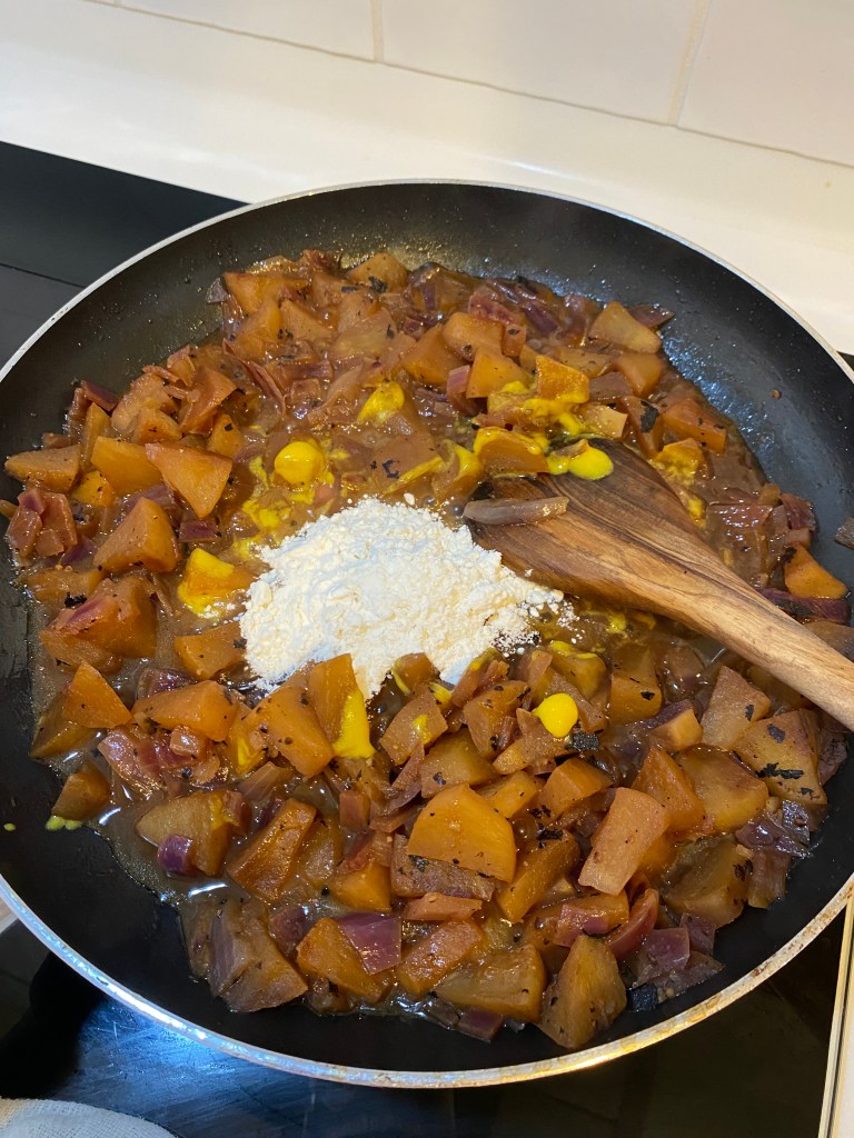 時間到開鍋蓋,這時蘋果丁和洋蔥丁已經變得很軟綿,倒入兩匙麵粉、黃芥末、鮮奶、乾燥義式香料,攪拌均勻成濃稠狀。