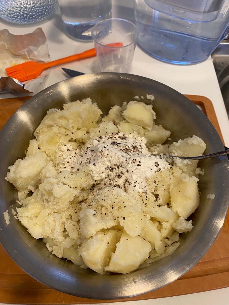 然後把稍早用電鍋蒸好的去皮馬鈴薯搗成泥狀,放入兩匙麵粉、鹽、黑胡椒(這時覺得太乾可以到入一些牛奶和奶油混合,會變得更綿密~)