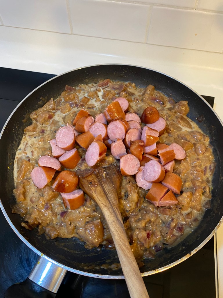 再把剛剛煎好的香腸切成丁,放入鍋中一起最後煮5分鐘左右讓味道融合在一起。