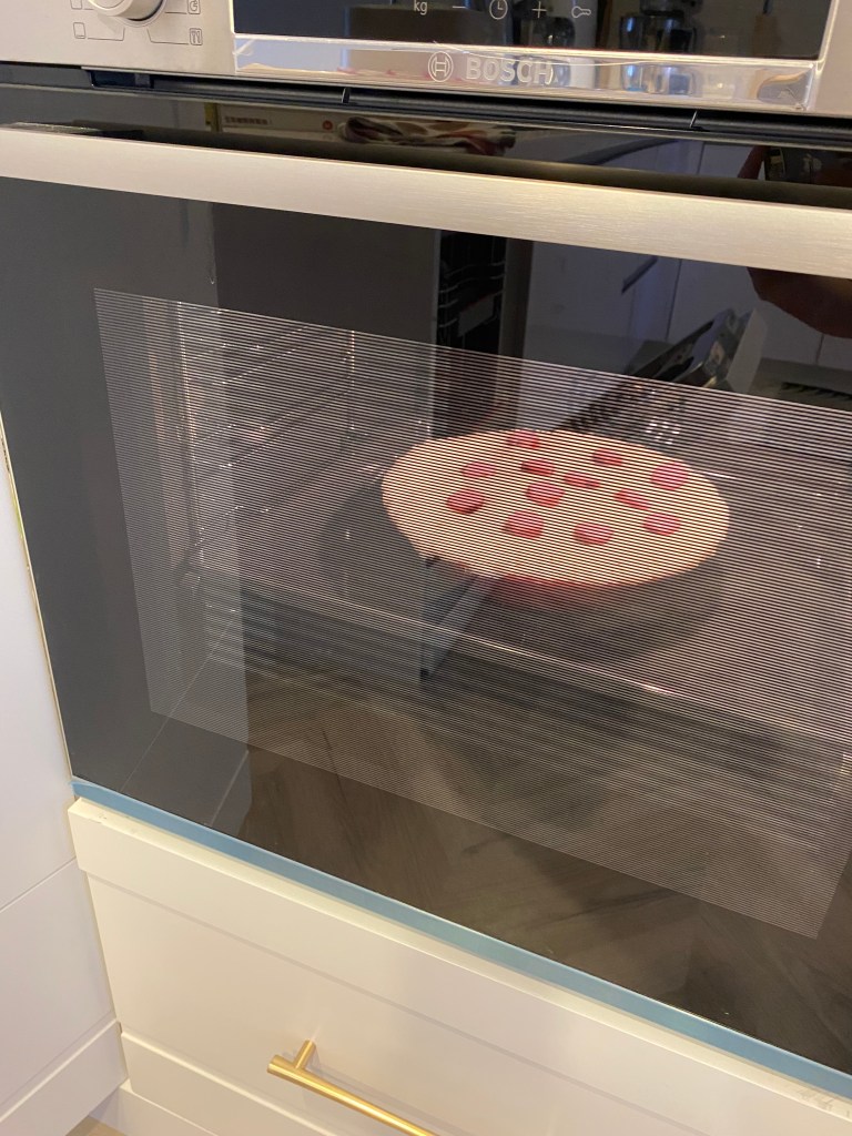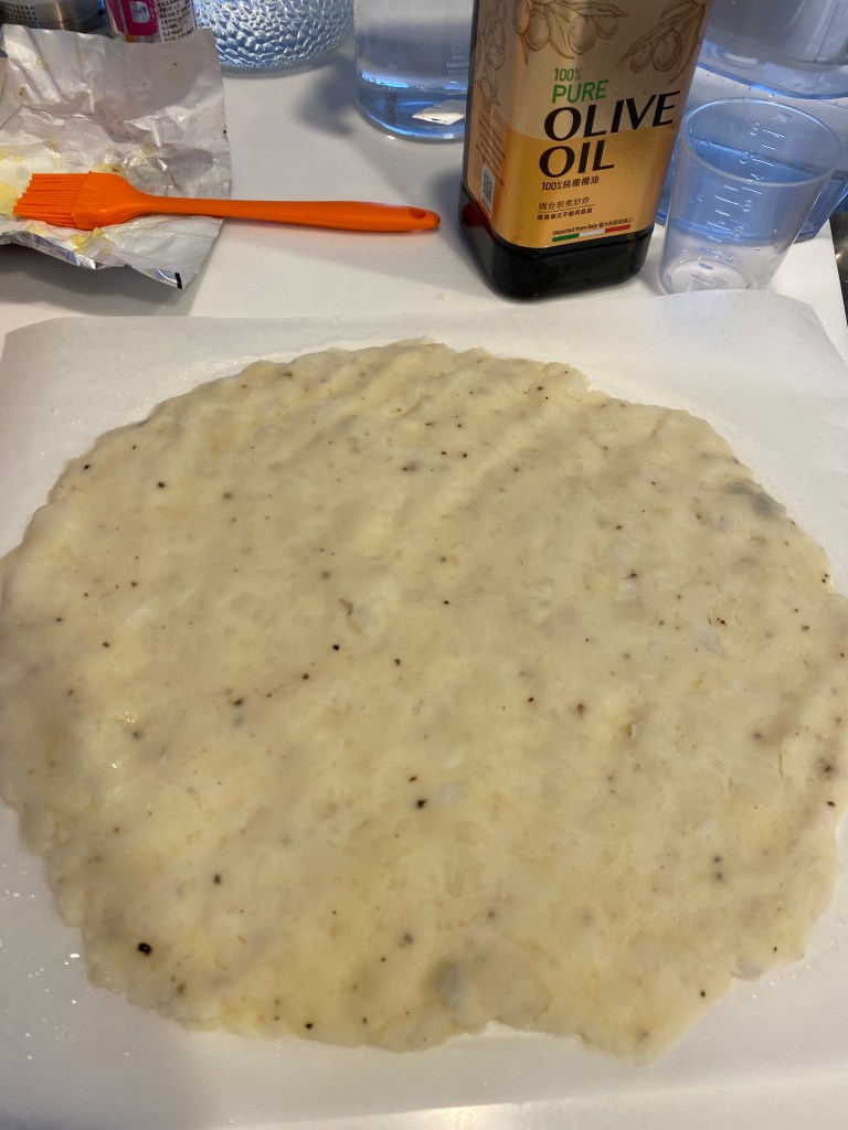 取一大張烘焙紙,在紙上淋上橄欖油,把剩下一半的馬鈴薯泥倒在烤盤紙上,均勻按成一個大圓型。