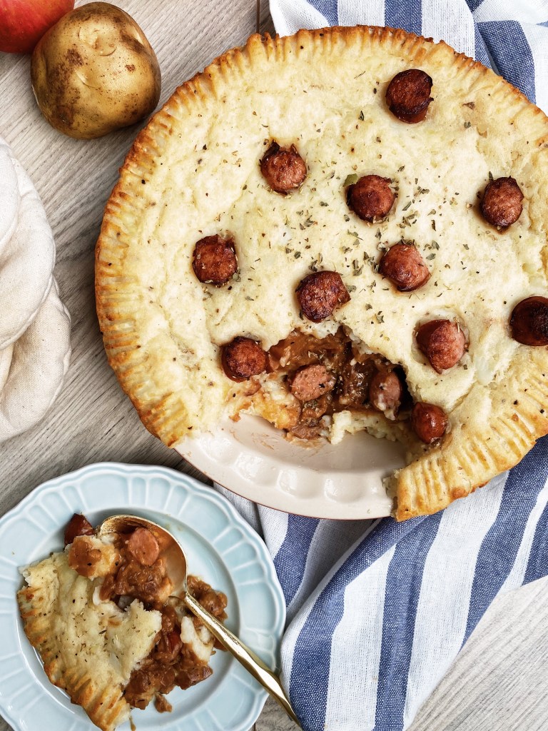 像這樣的派料理超適合和家人朋友分享(但現在疫情嚴重,只能用Lalamove送去給家人了~),外層是綿綿又滑順的馬鈴泥,裡面包覆著蘋果、香腸、洋蔥燉的內餡,香甜又帶有肉香和肉汁,切這樣一份就是一頓的主食了,既有飽足感在餐桌上也挺創新的❤️!