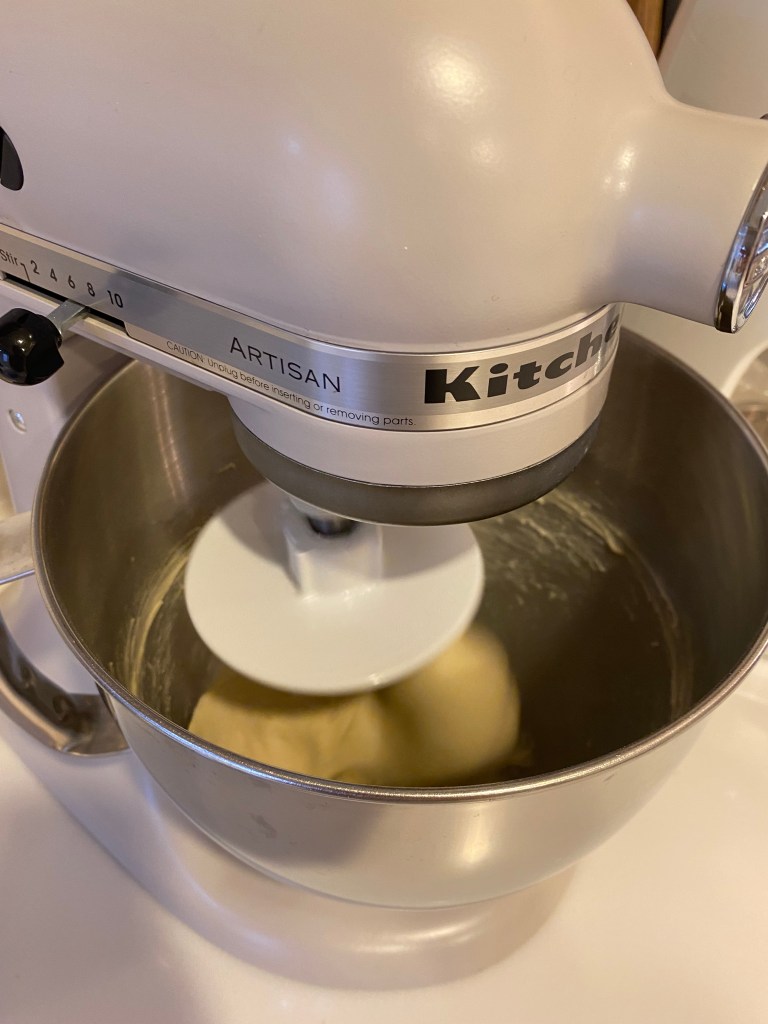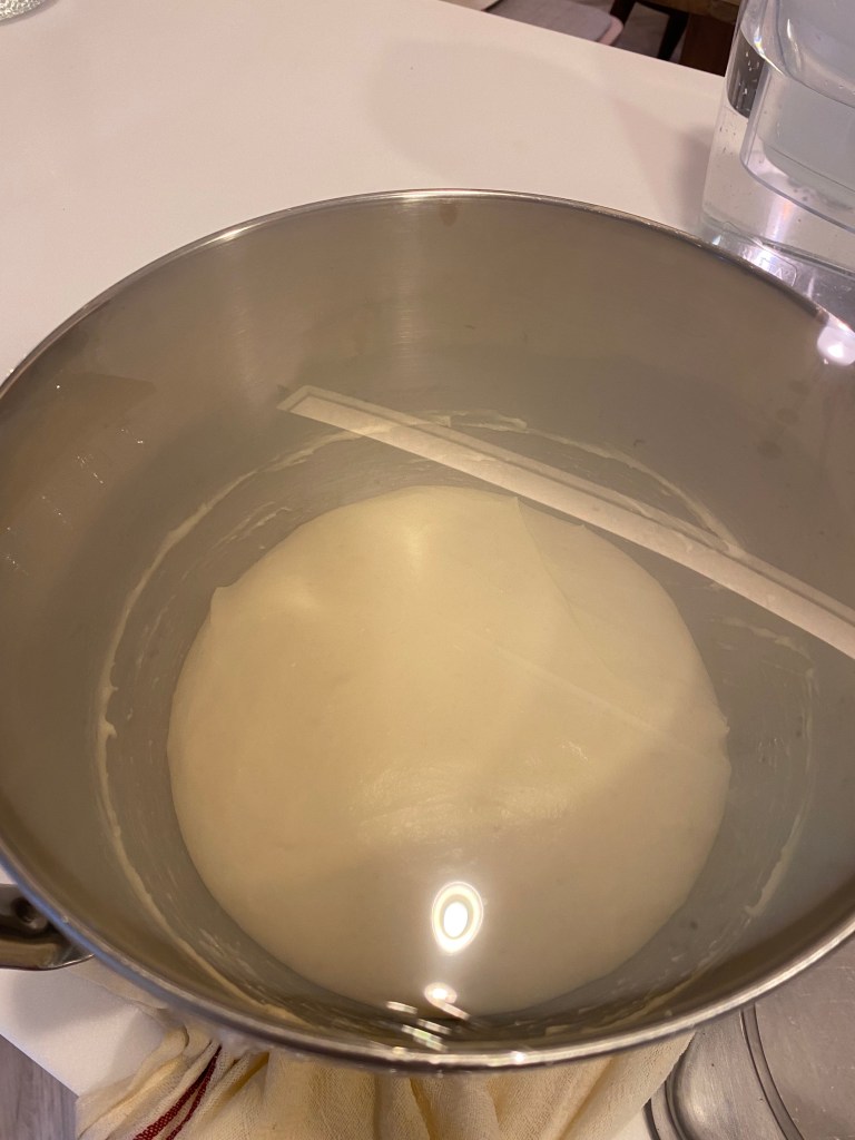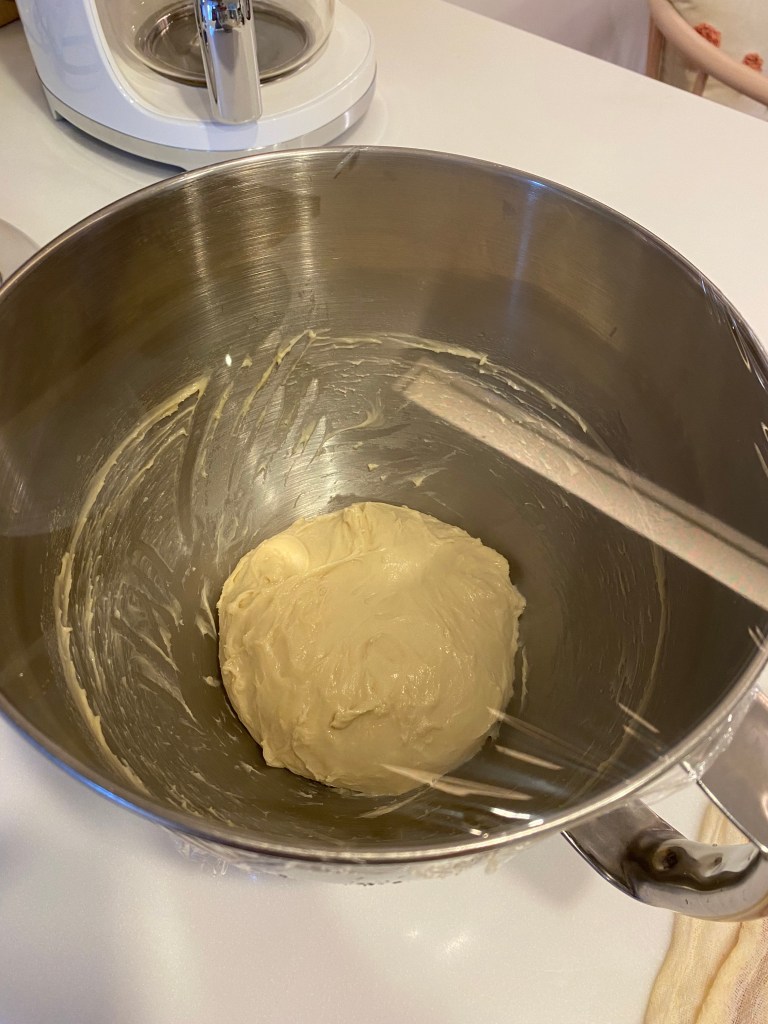 攪拌大約6~7分鐘後加入奶油,繼續中高速攪拌,至麵團出現薄膜,用保鮮膜封住,發酵至2倍大。