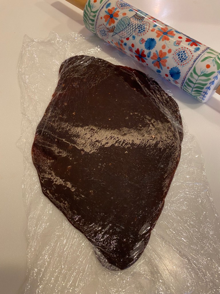 將巧克力內餡從冰箱取出,放在保鮮膜上桿開成長方形。