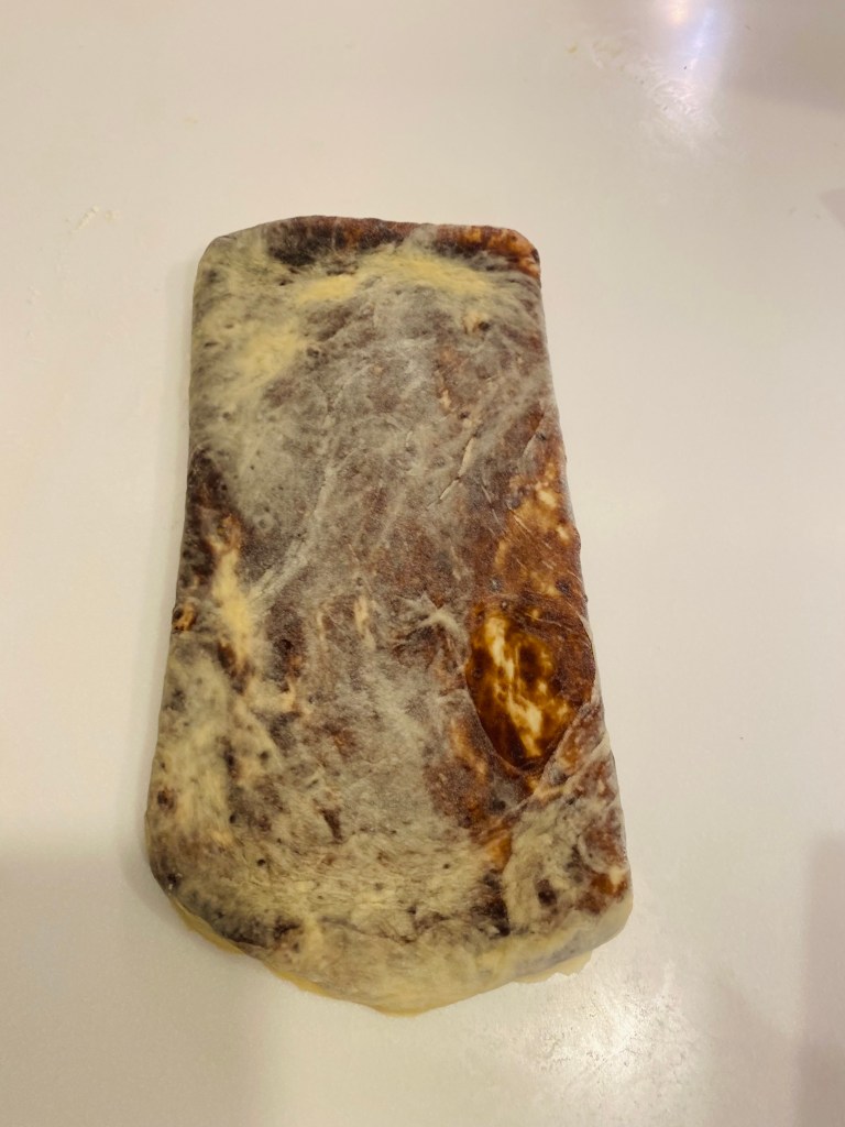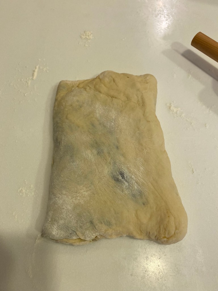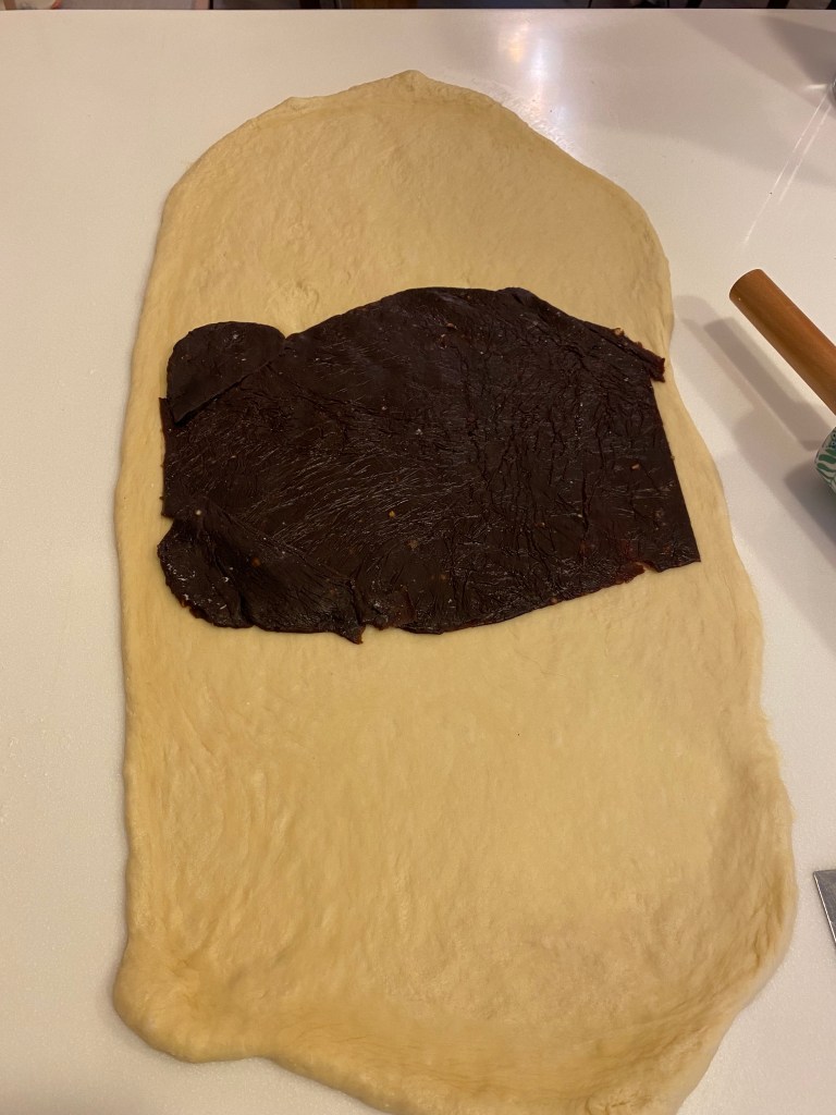 把巧克力內餡包在麵團裡,並桿開,折成三折轉90度桿開。