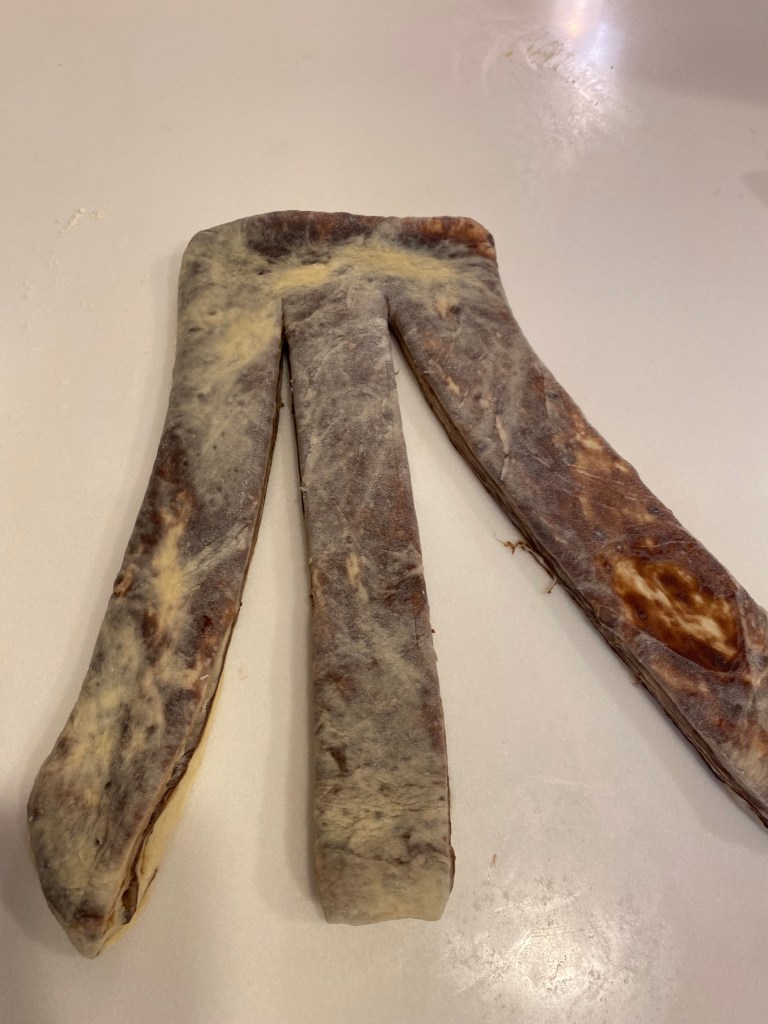 最後一次將麵皮桿開成為一個長方形,平均切成3條,上方不需要切斷,編成三股辮。