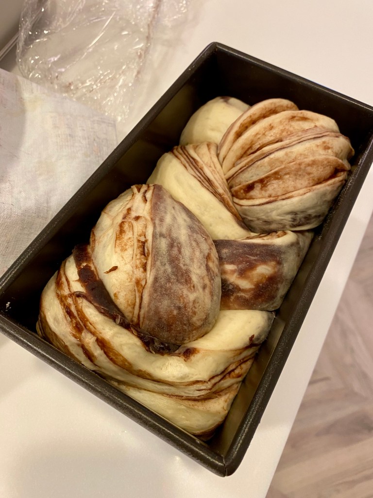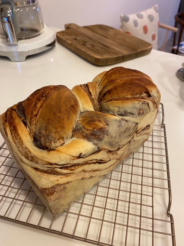➔ 時間到取出(好香呀~),趕快放在架上放涼,側面也好漂亮,看的到巧克力餡一層層的花紋,外皮看起來就很酥脆,巧克力大理石吐司完成!