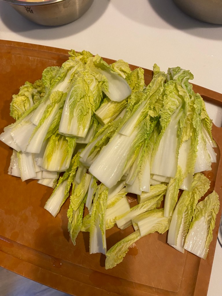 將鯛魚片斜切片,在碗中放入太白粉、鹽、白胡椒粉、薑片、橄欖油,抓醃15分鐘入味(可以放入少許米酒去腥,但因為我還在哺乳,所以就用薑片取代了哦~)