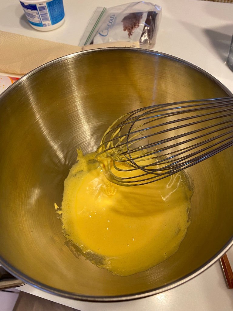 用義式咖啡機將黑咖啡煮好放涼備用,然後來製作蛋黃醬,在盆中倒入蛋黃兩顆、砂糖,攪拌均勻,攪拌至濃稠泛白後,再用隔水加熱的方式繼續攪拌到砂糖融化。