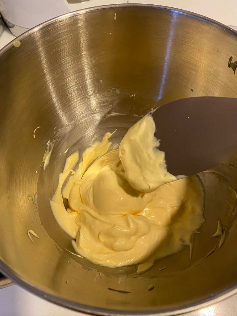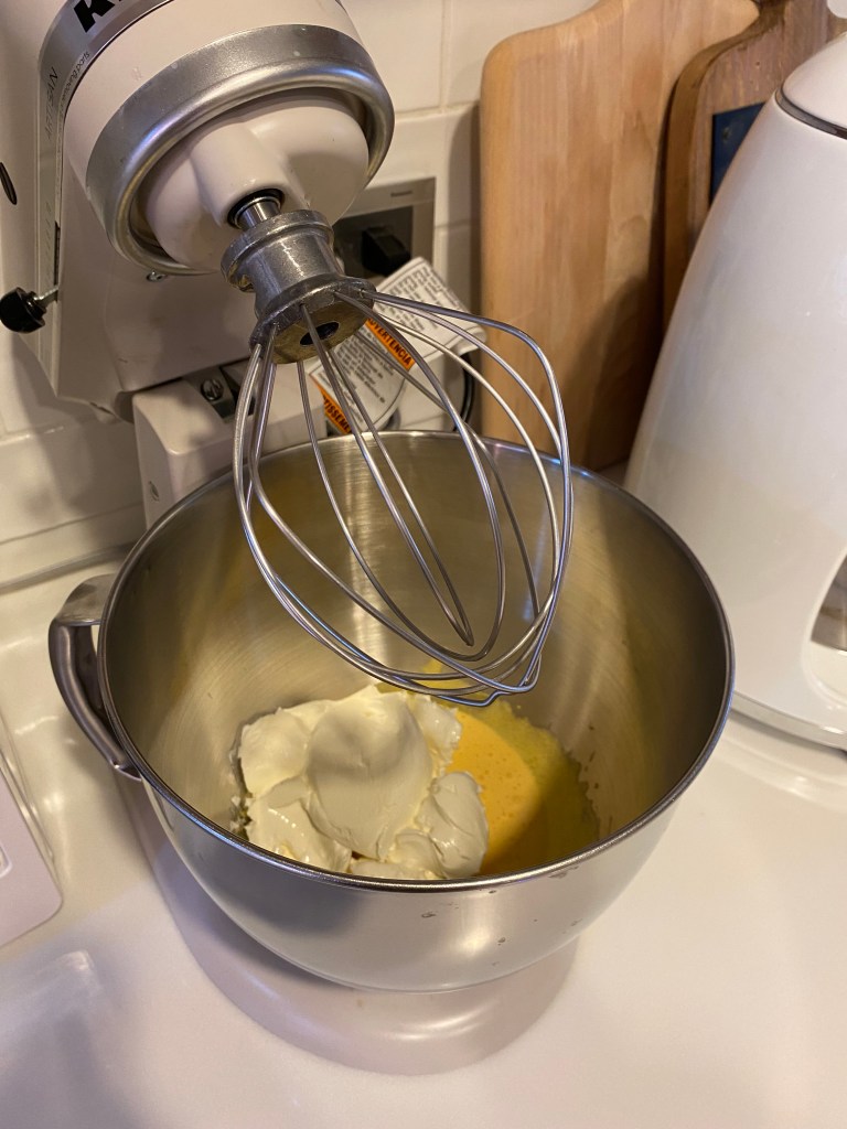 在蛋黃醬中加入馬斯卡彭起司,用攪拌機以最低速打勻至質地光滑即可。