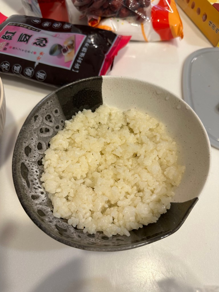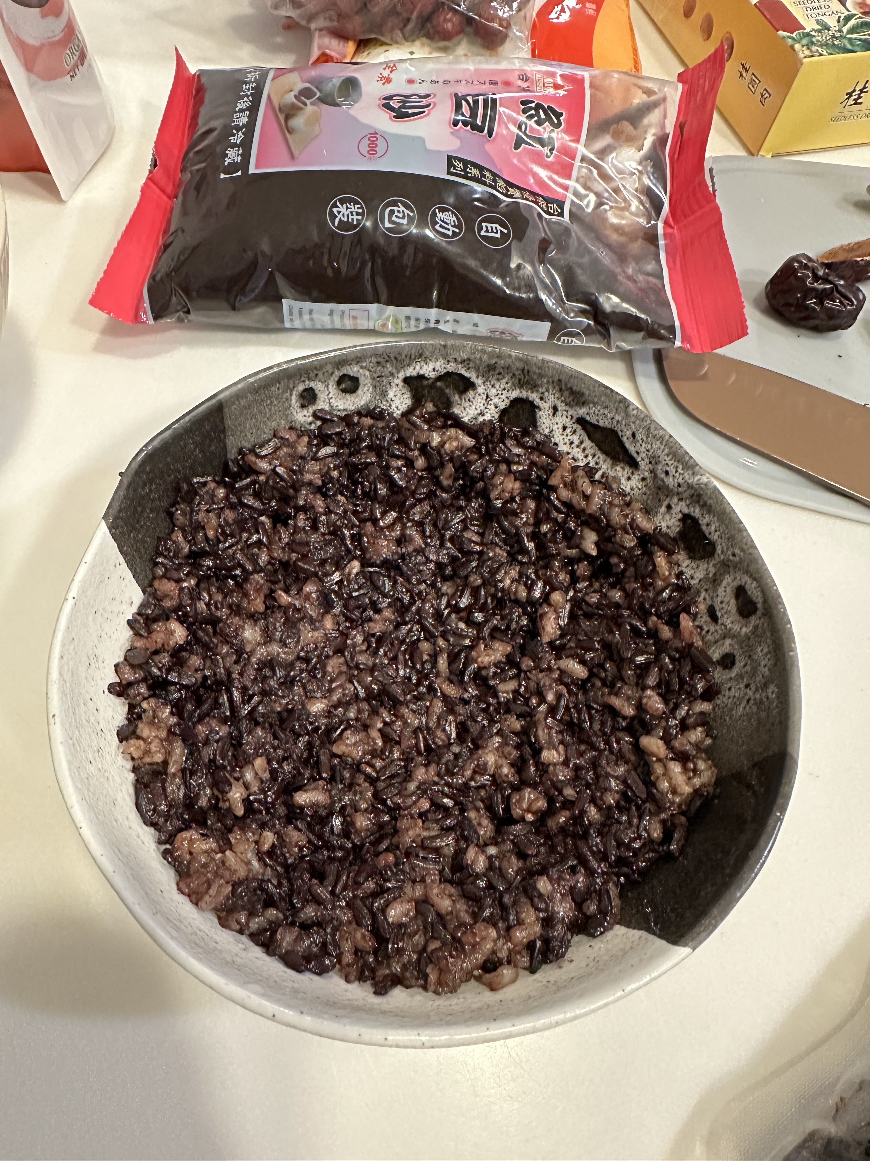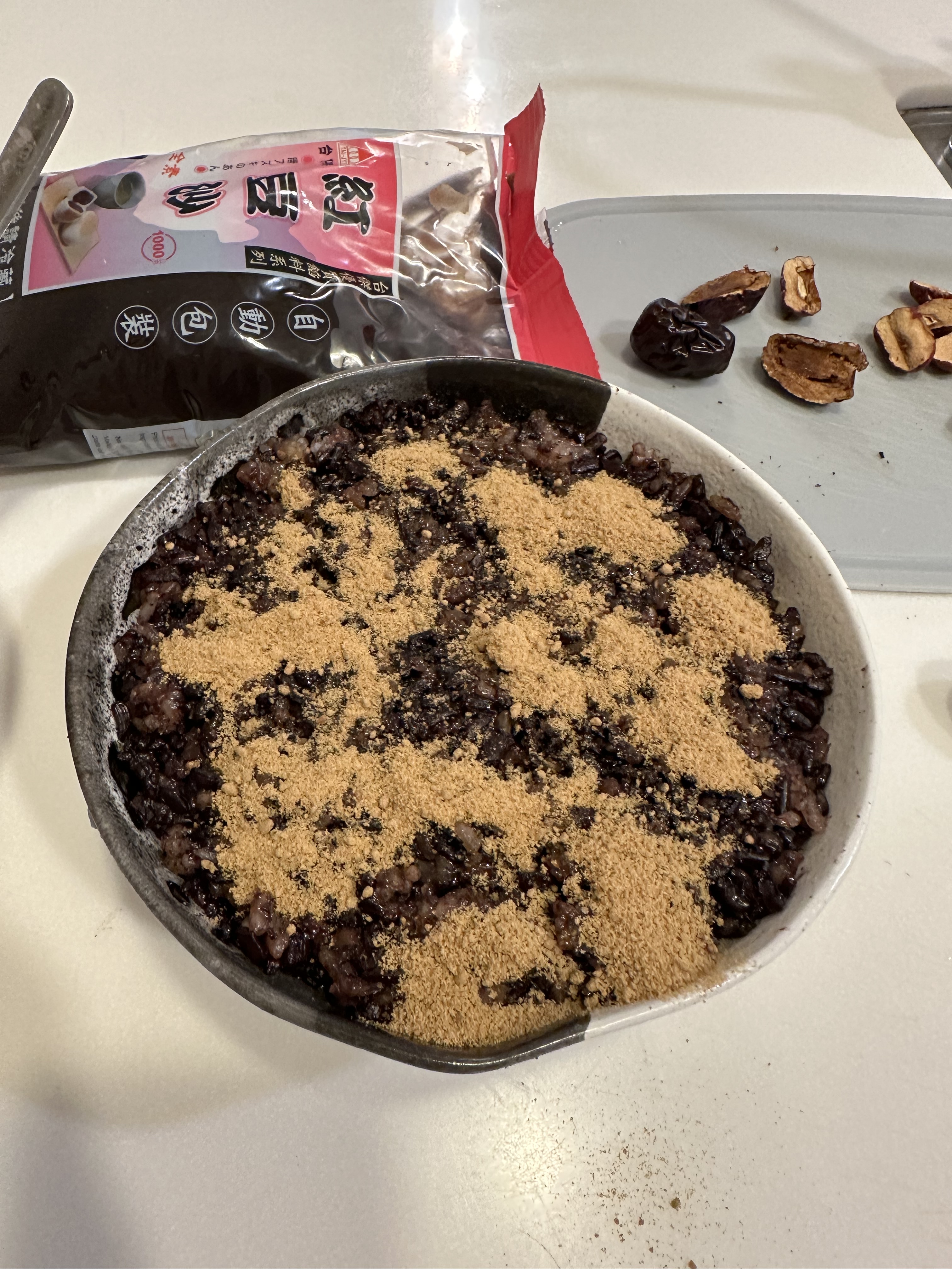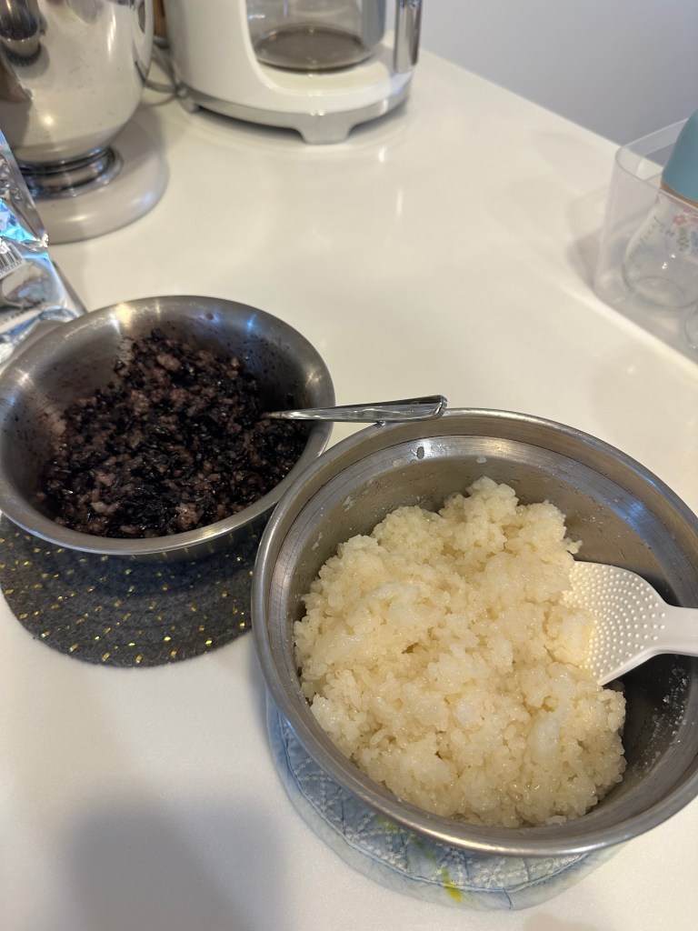 前一晚睡前先將圓糯米和紫米清洗乾淨浸泡一夜,隔天用電鍋蒸透米飯,蒸好後取出趁米飯還熱的時候放入砂糖和橄欖油或奶油拌勻。